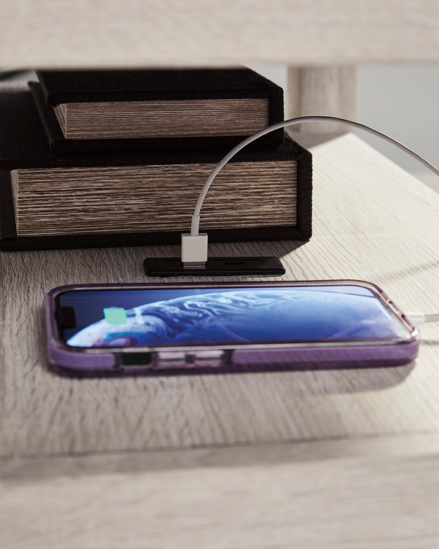 | Details | Made with MDF substrates and decorative paper laminate, Two-tone finish (replicated gray wood top and antiqued white base), 1 storage cabinet, 1 open display shelf, USB-A and USB-C charging ports, Power cord included; UL Listed | |