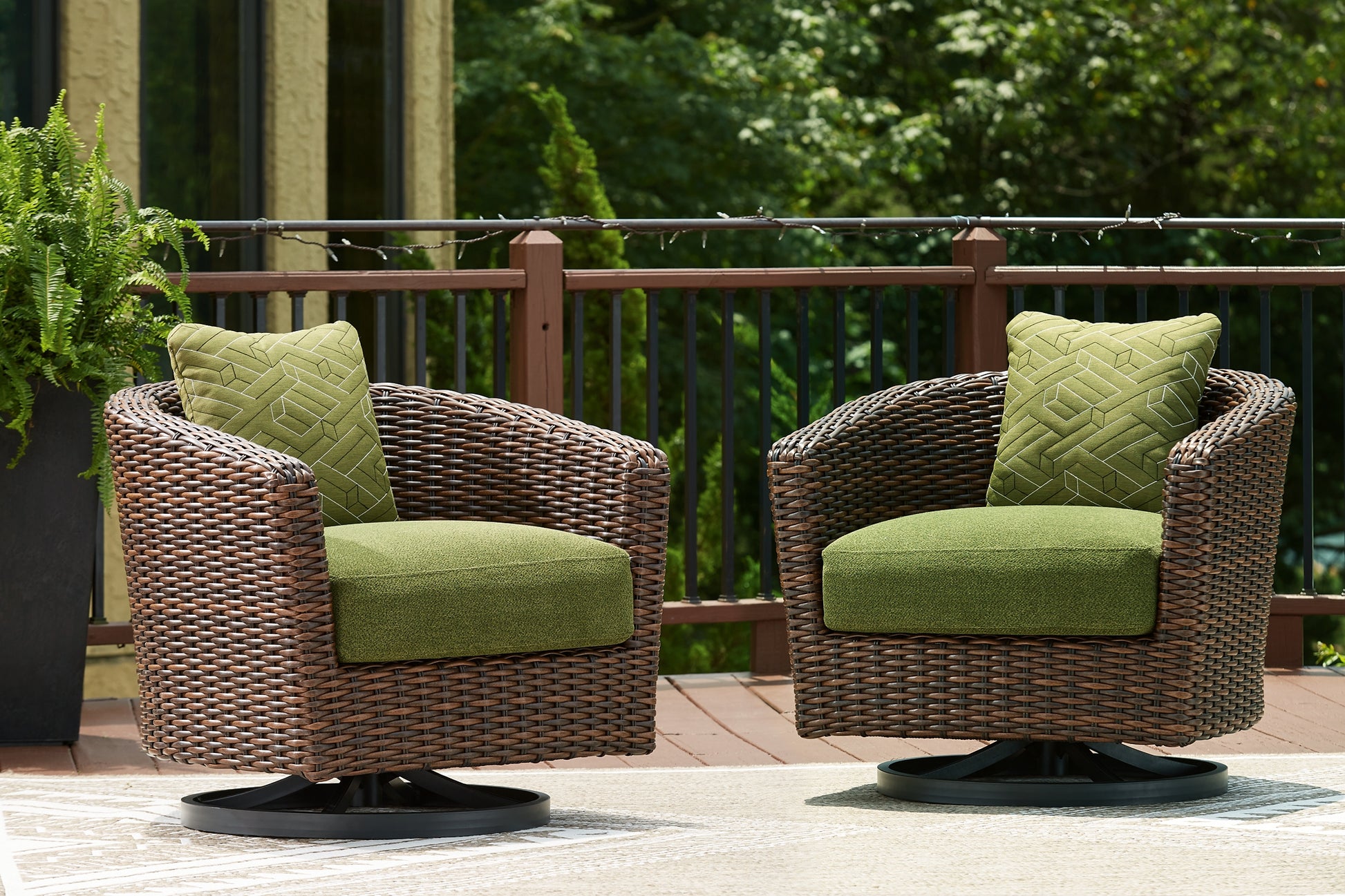 | Details | All-weather resin wicker handwoven over rust-resistant aluminum frame with durable powder coated finish, Powder coated aluminum resists rusting and fading, All-weather foam cushion core wrapped in soft polyester, Zippered cushions and throw pillows covered in solution-dyed high-performance fabric, Nuvella+ is an outdoor fabric that can be cleaned and offers enhanced UV resistance, Clean fabric with mild soap and water, let air dry; for stubborn stains, use a solution of 4 oz. bleach to 28 oz. water, Stainless steel hardware, Designed to withstand the harsh elements of the outdoors, 360-degree swivel, 1 throw pillow included, Assembly required | |