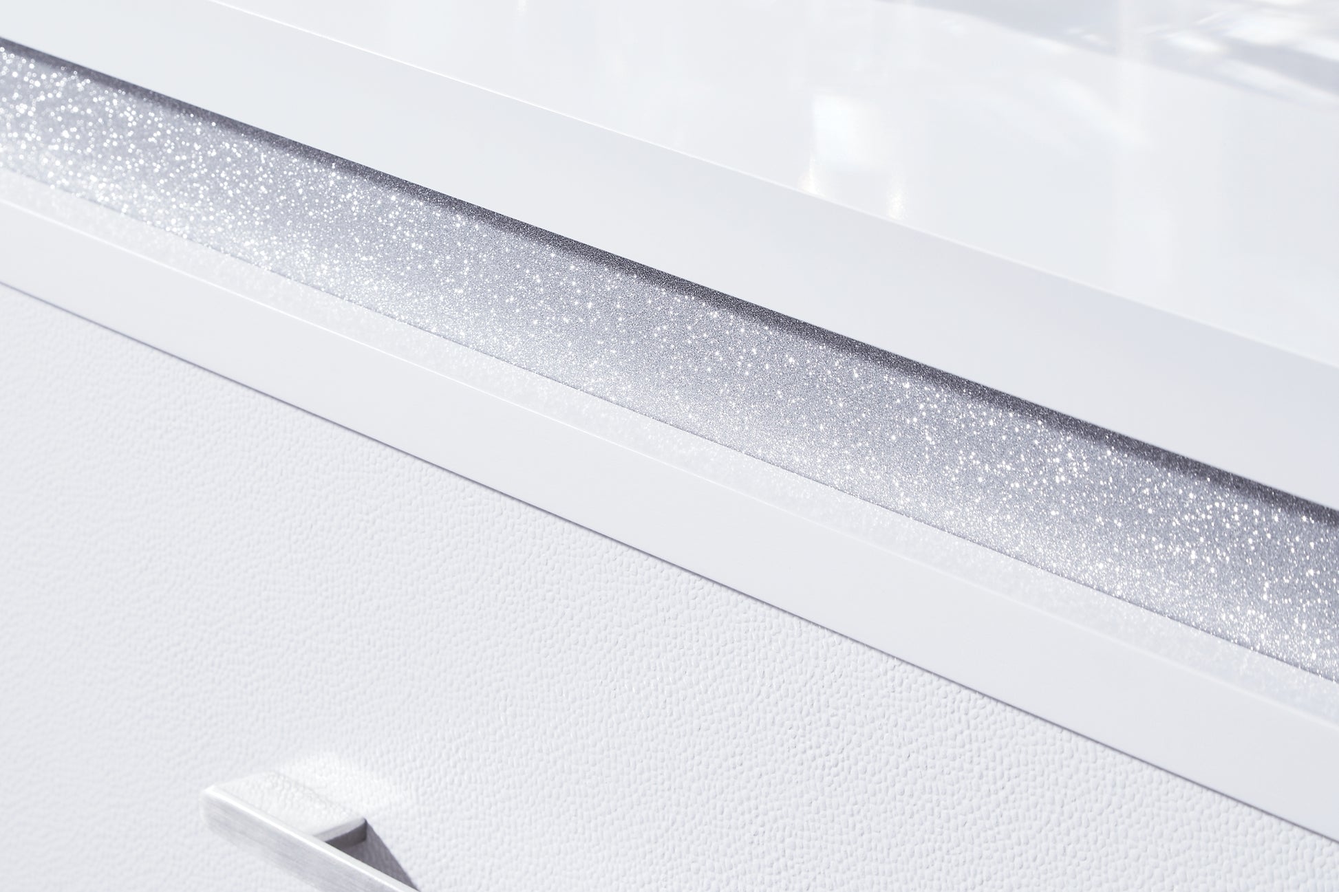 | Details | Made with hardwood solids and MDF substrates, White paint finish, Inset acrylic glitter accents, Horizontal metal drawer pulls, 2 drawers with fully finished interiors, dovetail construction and heavy-duty ball-bearing side glides, Textured drawer fronts | |