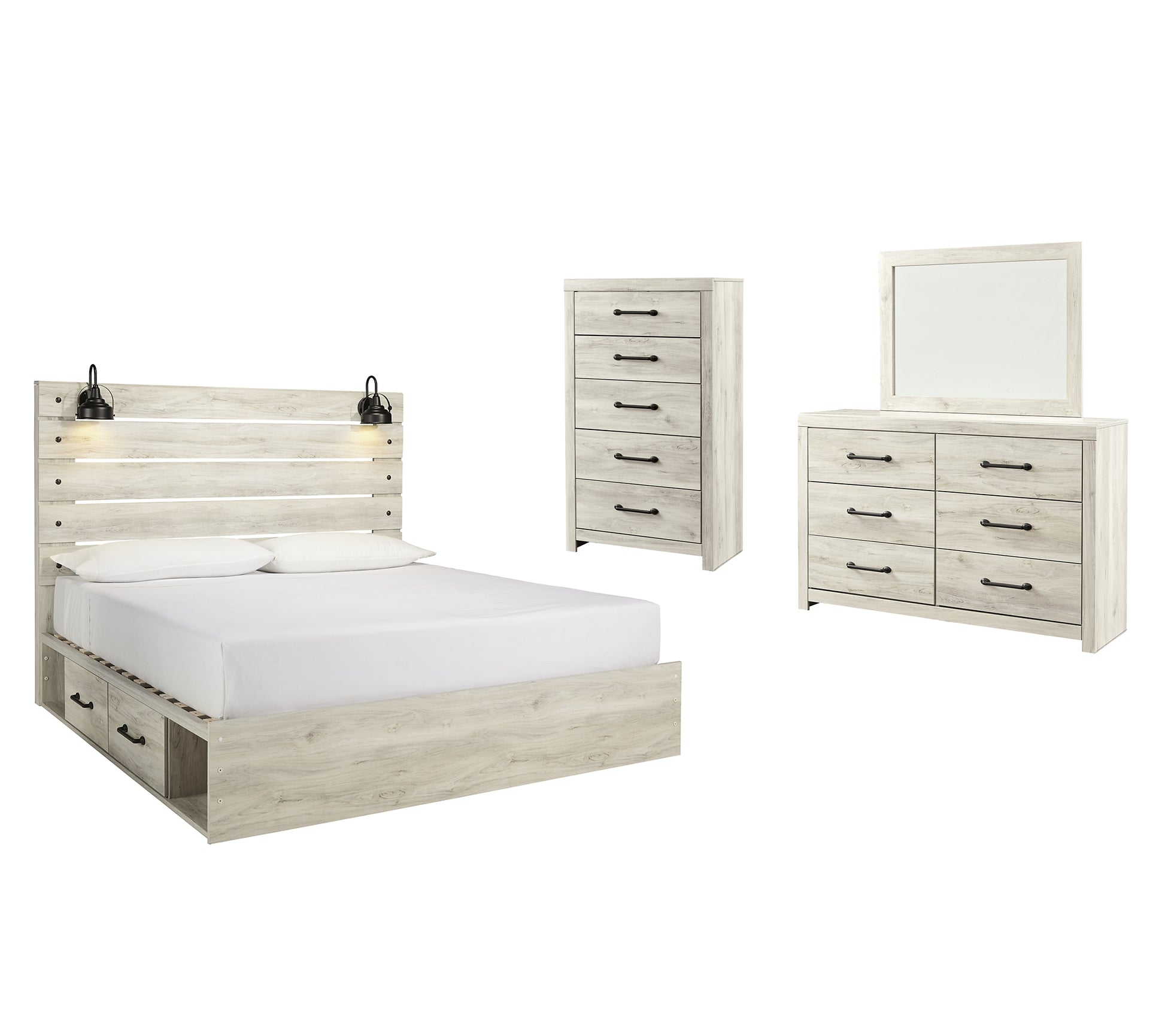 | Details | B192-46: Made of engineered wood (MDF/particleboard) and decorative laminate, Wispy white finish over replicated oak grain with authentic touch, Large-scale hardware with dark finish, 5 smooth-gliding drawers, Drawer interiors are lined with a faux linen laminate for a clean, finished look, Safety is a top priority, clothing storage units are designed to meet the most current standard for stability, ASTM F 2057 (ASTM International), Drawers extend out to accommodate maximum access to drawer interior while maintaining safety, B192B19: Includes headboard, footboard, side storage, rails and slats, Made of engineered wood (MDF/particleboard) and decorative laminate, Wispy white finish over replicated oak grain with authentic touch, Large-scale hardware with dark finish, 2 decorative sconce lights, LED with 3 AA batteries, 2 smooth-gliding storage drawers, 2 storage cubbies, 2 slim-profile USB charging ports, Power cord included; UL-listed, Bed does not require additional foundation/box spring; accommodates most zero clearance adjustable bases with the addition of a bunkie board, Mattress available, sold separately, Assembly required, B192B1: Includes dresser with mirror, Made of engineered wood (MDF/particleboard) and decorative laminate, Wispy white finish over replicated oak grain with authentic touch, 6 smooth-gliding drawers, Drawer interiors are lined with a faux linen laminate for a clean, finished look, Large-scale hardware with dark finish, Mirror attaches to back of dresser, Assembly required, B192-92: Made of engineered wood (MDF/particleboard) and decorative laminate, Wispy white finish over replicated oak grain with authentic touch, Large-scale hardware with dark finish, 2 smooth-gliding drawers, Drawers lined with faux linen laminate for finished aesthetic, 2 slim-profile USB charging stations, Power cord included; UL Listed, | |