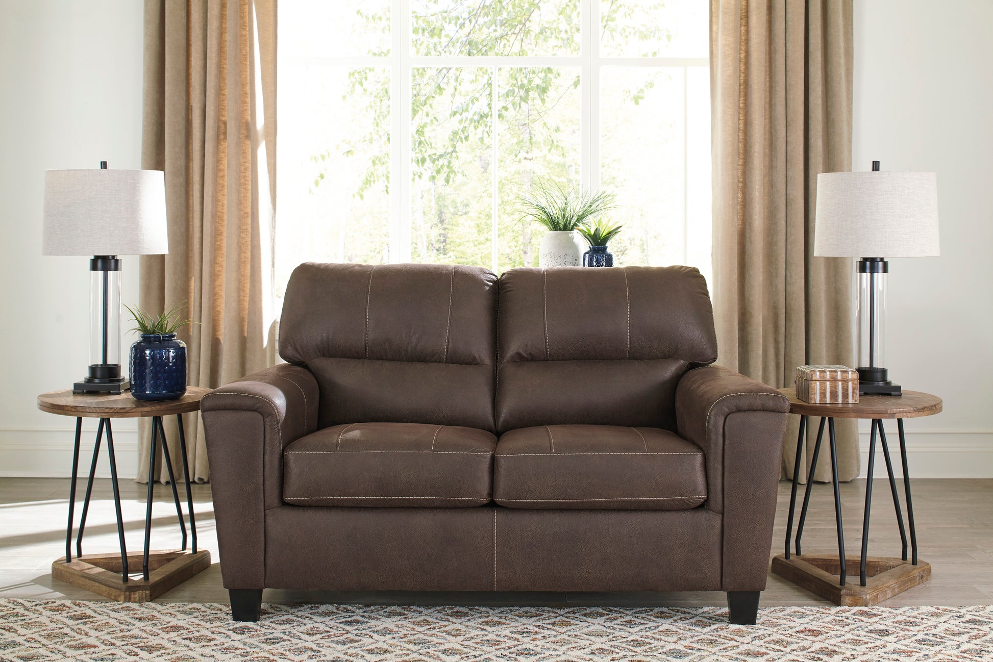 If you love the cool look of leather but long for the warm feel of fabric, you can take comfort in this loveseat. Wrapped in a fabulous microfiber with a weathered hue and hint of pebbly texture to resemble the real deal, this decidedly modern loveseat proves less is more. Elements include angled side profiling and track armrests wrapped with a layer of pillowy softness for that little something extra. Prominent jumbo stitching and clean-lined divided back styling lend fashion-forward flair.