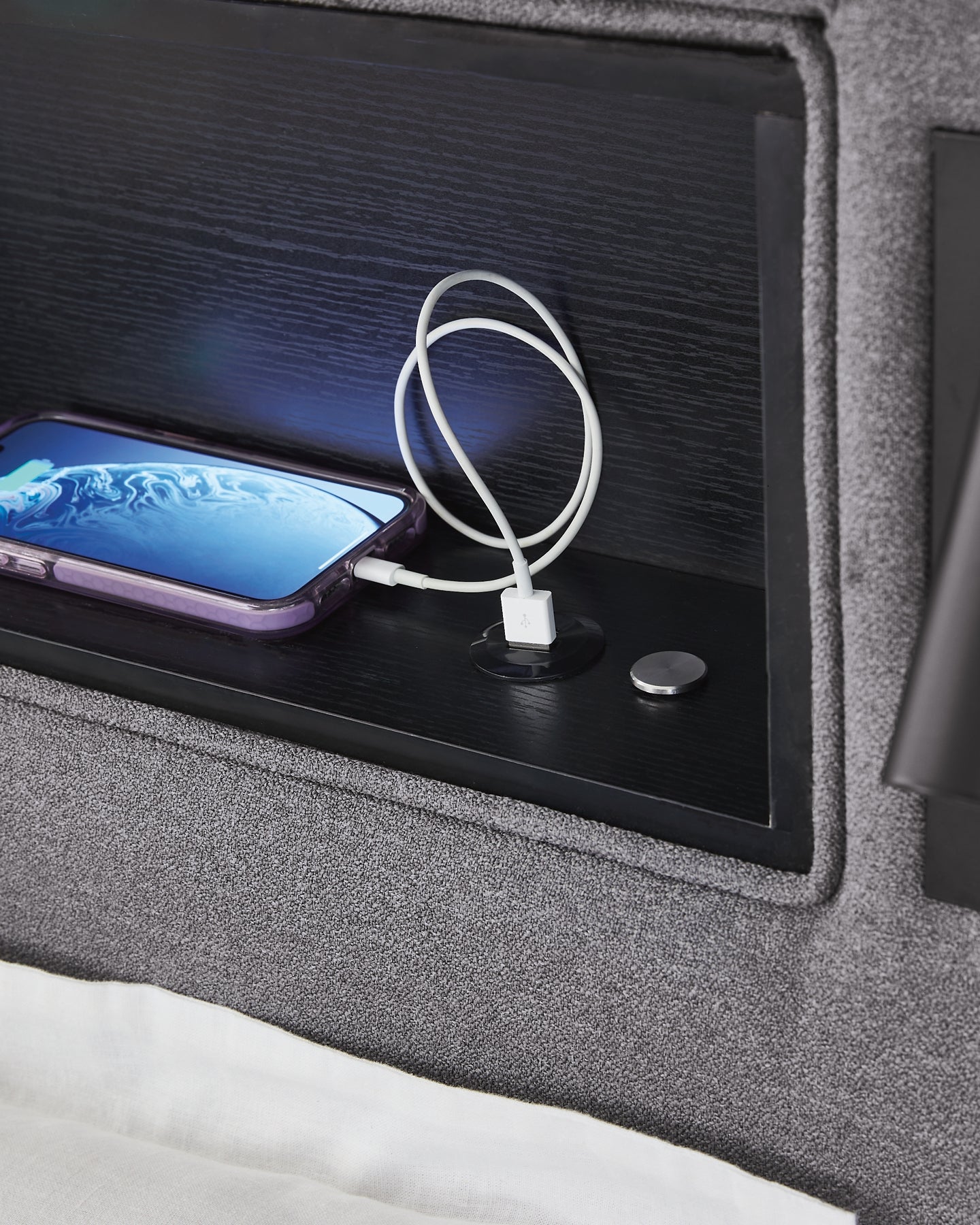 | Details | Includes upholstered headboard, footboard, rails and roll slats, Made with engineered wood frames, solid wood components and foam, Polyester upholstery, Multicolored ambient LED lighting in headboard and lower footboard rail, LED reading light with articulating arm on each side of bed, Bed does not require additional foundation/box spring; accommodates most zero clearance adjustable bases, Mattress available, sold separately, Power cord included; UL Listed, Assembly required | |