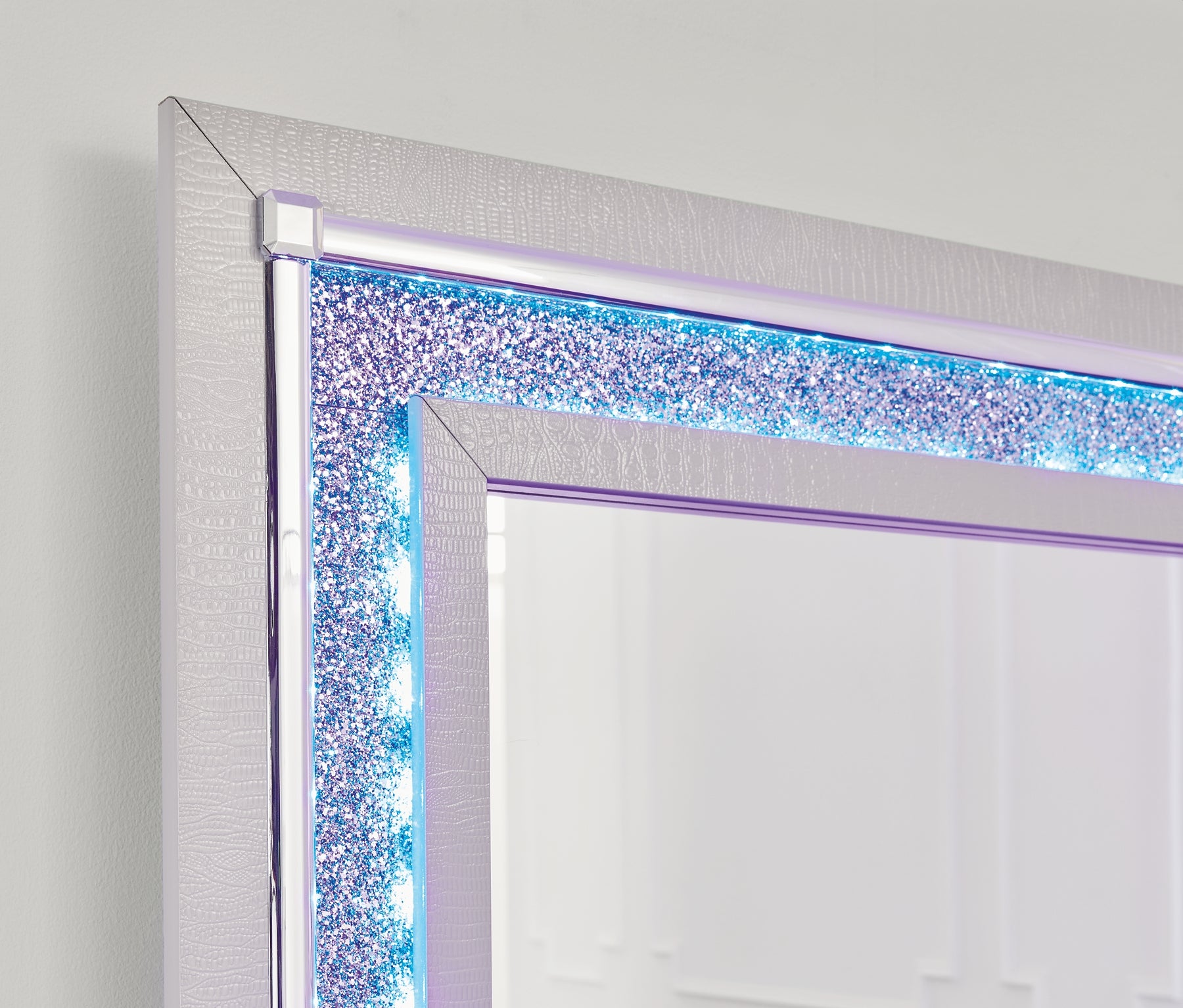 Details | Includes dresser and mirror, Made with engineered wood (MDF/particleboard/plywood) and decorative laminate for the right balance of affordability and durability, Silvertone pearl finished faux gator, Decorative laminate replicates natural or man-made material surfaces with consistent color, pattern and texture, Handles with faux crystal accents, 6 smooth-gliding drawers , Drawer interiors are lined with a faux linen laminate for a clean, finished look, Faceted chrome-tone details, Mirror includes LED lighting with remote for color and brightness options, Mirror attaches to back of dresser; can also be mounted on wall horizontally or vertically , Safety is a top priority, clothing storage units are designed to meet the most current standard for stability, ASTM F 2057 (ASTM International), Drawers extend out to accommodate maximum access to drawer interior while maintaining safety, Minor assembly required | |